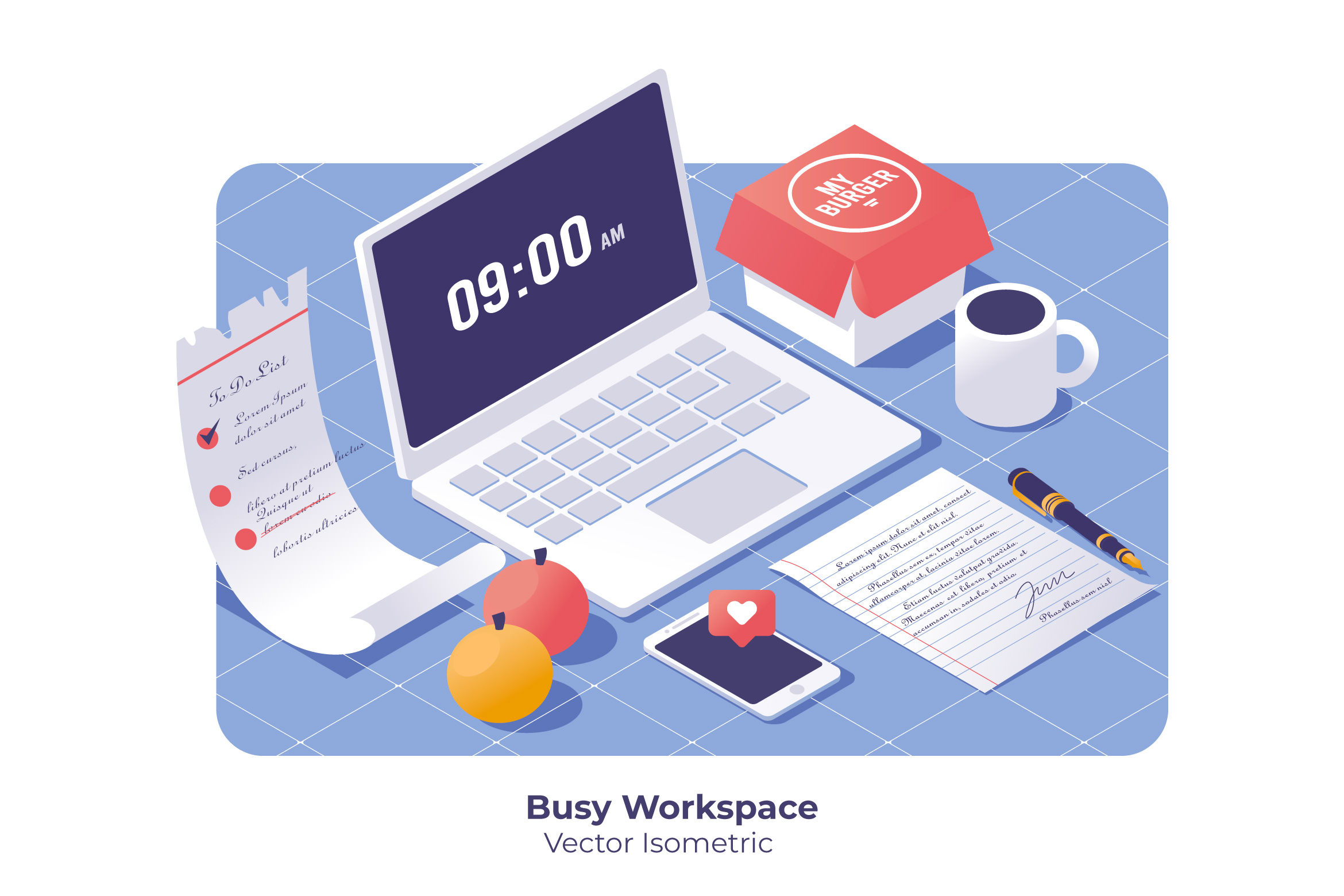 In this template, you will get a laptop image and other related objects such as a smartphone, pen, paper, coffee, and burgers. Therefore, you can easily use and arrange these objects that suit your website design. Just like other vector illustrations, you can also edit them seamlessly in Adobe Illustrators.